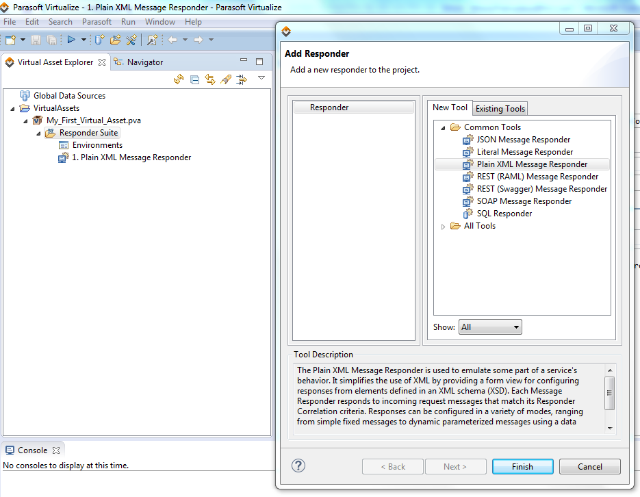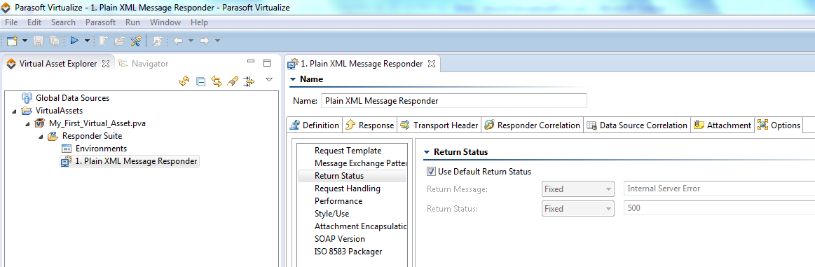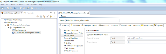 There are many type of Responders can be created from Parafost Virtualize. Some of the common examples are XML or JSON responders, Literal responders etc. It is possible to add more than once responder to VA, and correlate it with an incoming http header, url parameter, request body element etc. As the first steps let’s add a XML responder. An XML responder will return an xml message when it is called. For this follow Responder Suite -> New tool -> Plain XML Responder. Then add a XML message to response body.