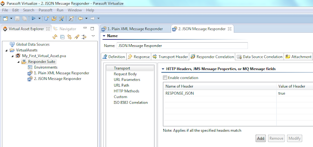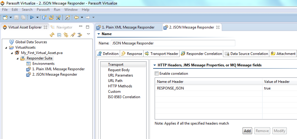 If we need to return some response from VA based on the value of an incoming HTTP header, that can be done using header correlation. Let’s add the JSON Responder this time. Add a JSON response.